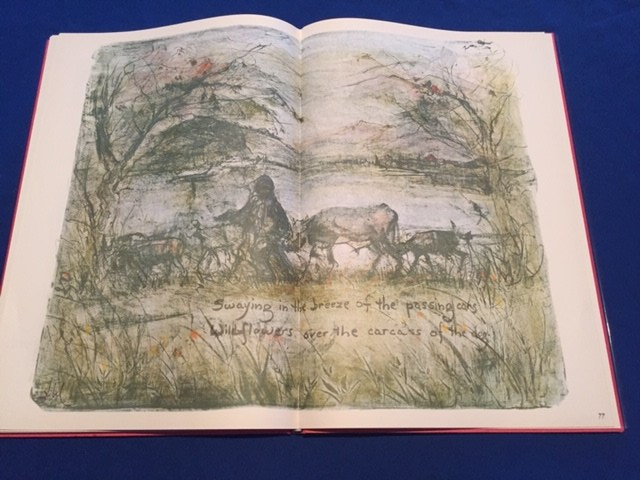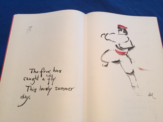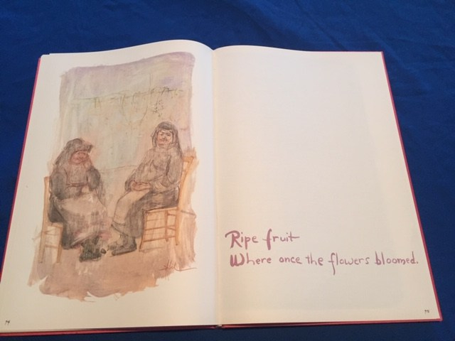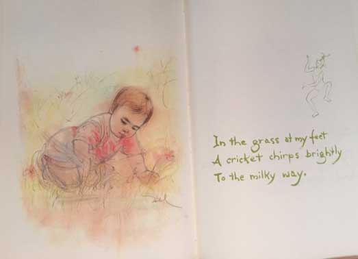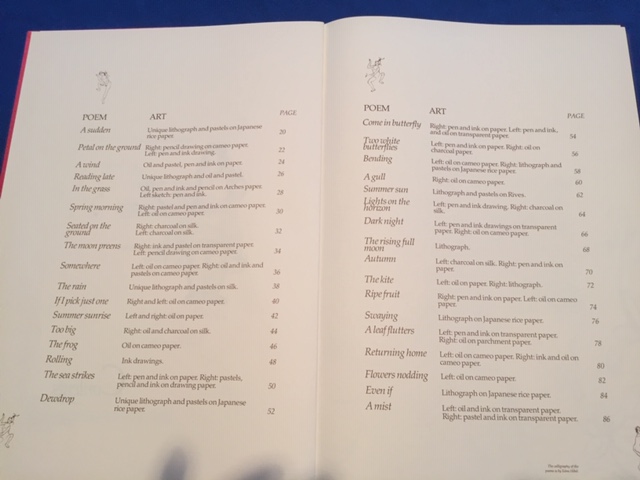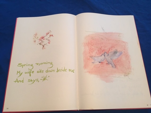 A coffee table book ( 18″ high X 12 1/2″ wide), 88 pages, filled with whimsical reproduced original colored drawings, pastels, charcoals and oil paintings by Edna Hibel juxtaposed against Haiku poetry written by Theodore Plotkin, Edna’s husband of 72 years. Theodore was an expert in the form of Haiku poetry
