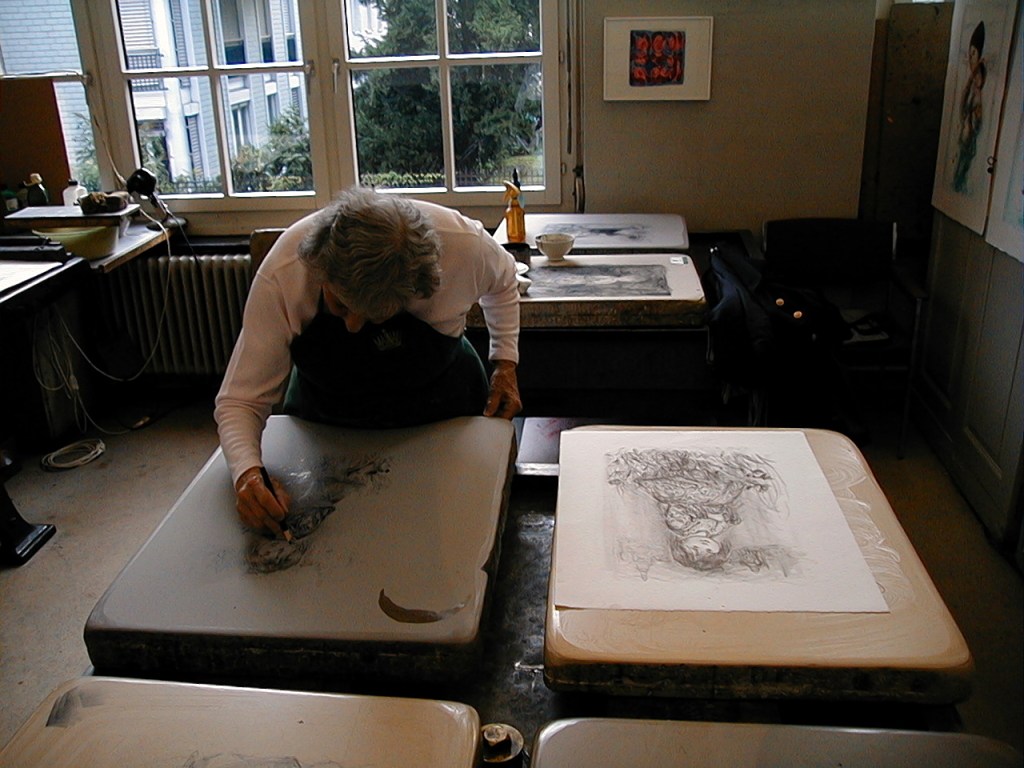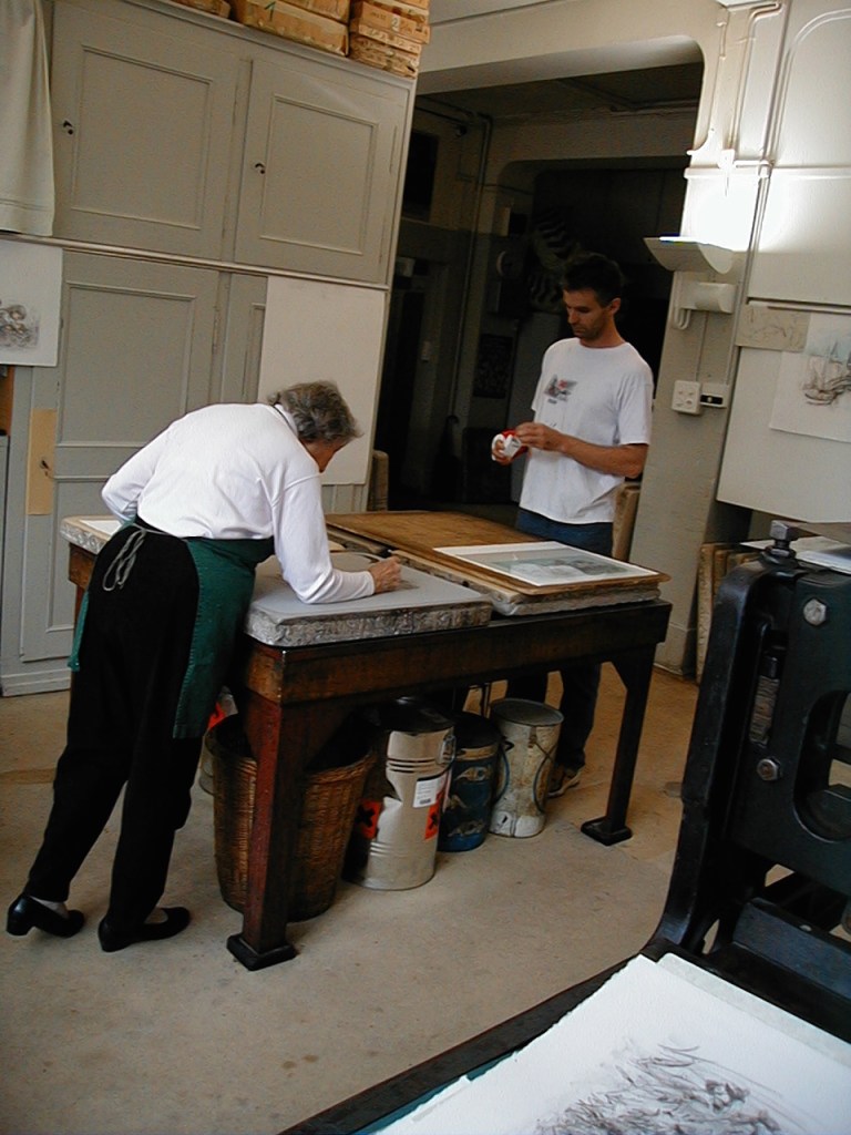 When the drawing is completed, the surface of the stone is washed over with an etching solution composed of gum Arabic and a weak acid, usually nitric acid. The acid etches those areas covered by the grease and wax so they will accept the ink that will be applied, while the gum Arabic seals the rest of the surface so that when it is wet,it repels the ink. Here the master printer is spot etching to eliminate technical blemishes.