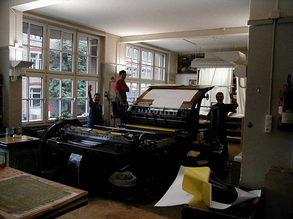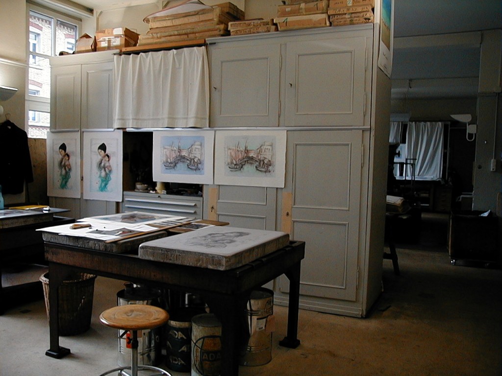 The printing is usually done on a hand press with a sliding bed that moves under a wood and leather scraper. The scraper applies the extreme pressure necessary to achieve high quality impressions. Sometimes the stone breaks under the intense pressure. The impression pulled on the paper is the mirror image of the one drawn on the stone.