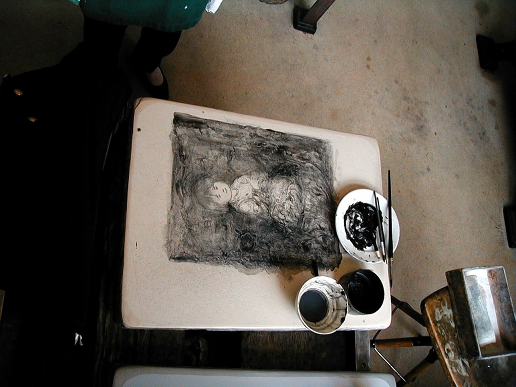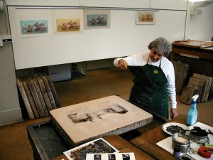 Ink is carefully rolled onto the stone, depositing ink only to those areas of the stone covered by the drawing. The skilled printer carefully judges the right amount of ink for each impression pulled from the stone.